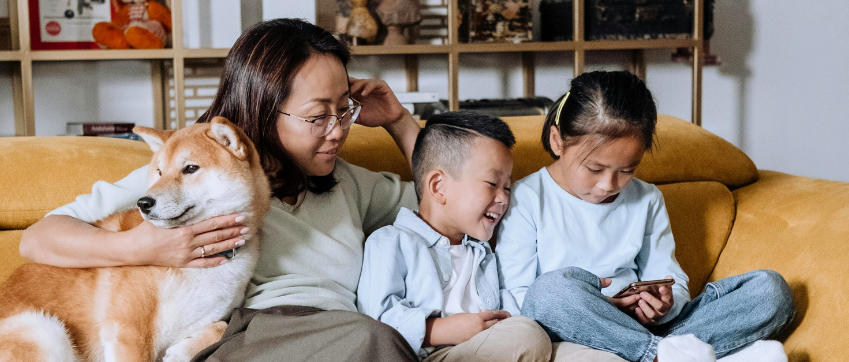 A woman and two school-aged children sit on a couch, one child is watching a phone, the other laughs, as the woman looks at them and smiles as she pats a dog sitting next to her.